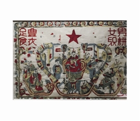 1952年,对于翻身做主人的劳动人民来说,喜悦之情溢于言表,而年画可以说是一个载体,它承载了当时人们的喜好和欢乐。这张《丰衣足食》年画(图3),上方有纪年款,在年画中并不多见。上方左右侧分别有“男耕女织”“丰衣足食”八个红字,内中蕴含着“劳动光荣”的寓意。字体中间,是一个红色的五角星,这无疑是人民政权的象征。下方的图案,是三个银锭型的物件,占据中间银锭主导位置的,是红衣服的财神,两边各有随从。仔细看,两边还有“招财”“利市”的小字,在财神最前侧,还有两个小孩围着一独角瑞兽正在嬉闹,独角瑞兽身上,摆放着一盆万年青。而左右两方银锭内有和合二仙、文臣武将等人物。整张年画人物虽多,却不繁杂,呈现出热闹红火的景象,如实地反映了当时的特色。