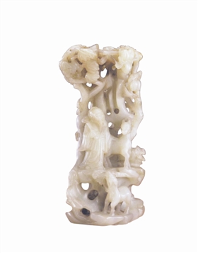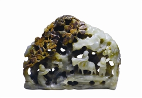 值得一提的是,清代玉山雕琢受清初“四王”画风影响很大,山石布局讲究均衡、稳重,层林叠起,意境清淡,故在雕造时力求古朴庄重、用刀平稳、转折圆润,不同于民间玉器裁花镂叶的装饰作风。遗憾的是,乾隆以后由于大件玉料来源匮乏,山子的雕造开始衰败。