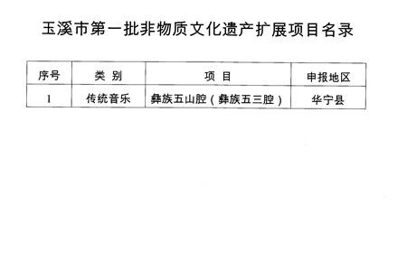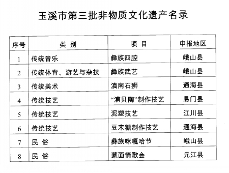 (图∕文 王溢)玉溪市人民政府2013年6月21日公布了第三批市级非物质文化遗产名录和第一批市级非物质文化遗产名录扩展项目名录。经玉溪市非物质文化遗产保护工作专家委员会严格评审,玉溪市非物质文化遗产保护工程领导小组审核遴选,玉溪市人民政府同意以下项目列入名录。